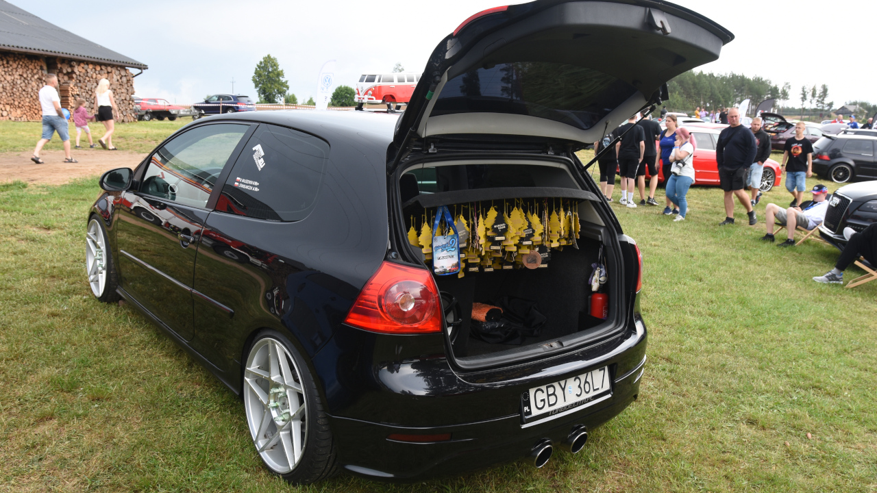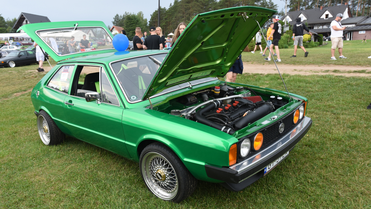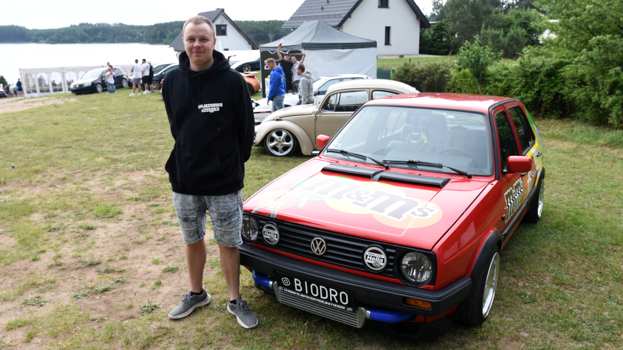 Przyjechałem golfem "dwójką" z 1989 roku z silnikiem 1.8 turbo. Pomysł m&m`s wpadł rok temu i myślę, że rzuca się w oczy, jest co oglądać. Środek aktualnie jest oryginalny oprócz kierownicy, no ale z zewnątrz zawieszenie, hamulce wszystko jest pozmieniane, włącznie z silnikiem, skrzynią od A do Z.