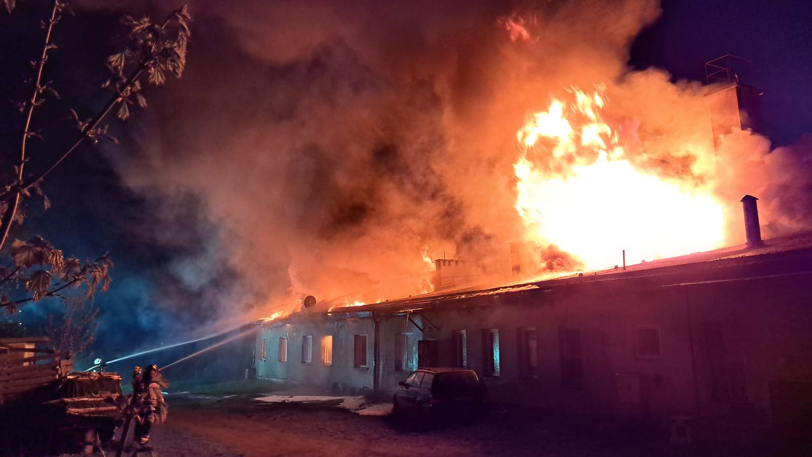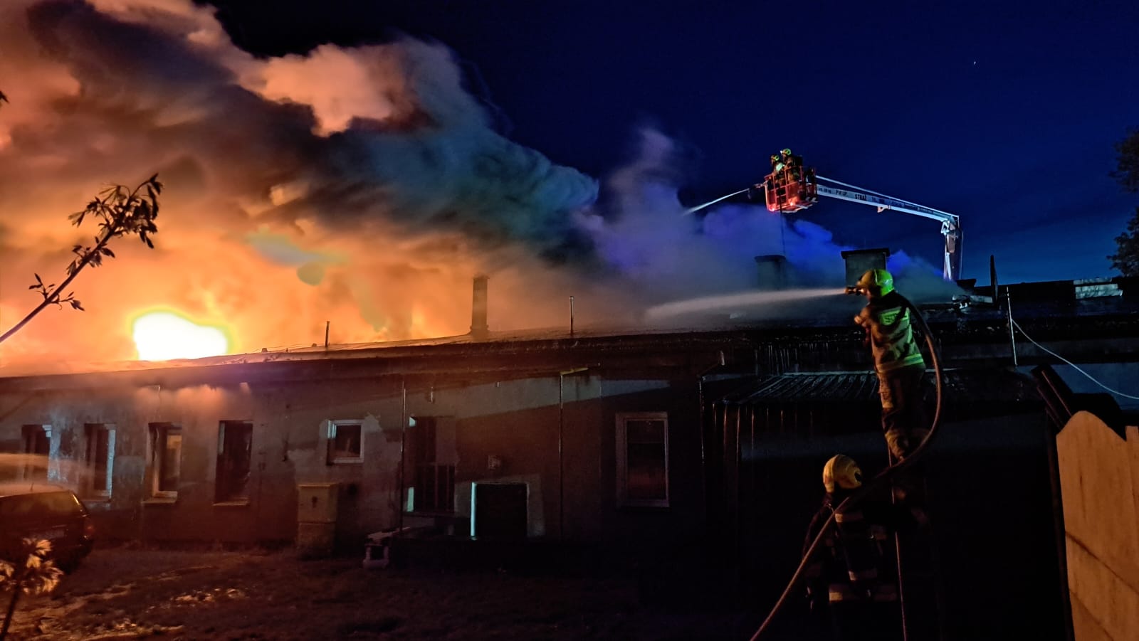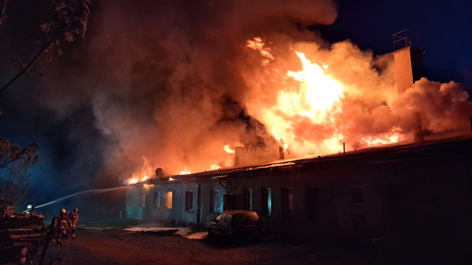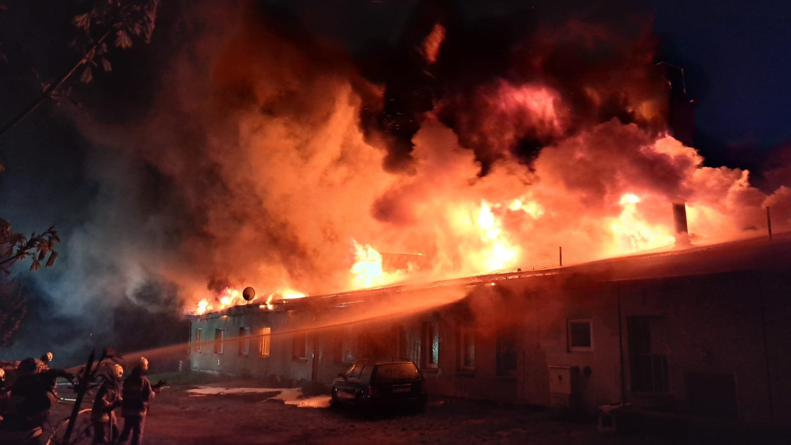 "Z dachu wyszły płomienie". Spłonął barak mieszkalny w Człuchowie. Z ogniem walczyło 17 zastępów straży pożarnej (FOTO, WIDEO, AKTUALIZACJA)