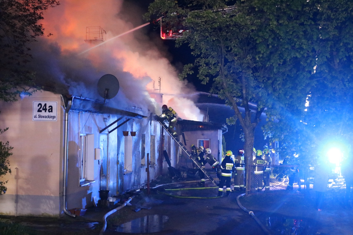 Z dachu wyszły płomienie. Spłonął barak mieszkalny w Człuchowie. Z ogniem walczyło 17 zastępów straży pożarnej FOTO, WIDEO, AKTUALIZACJA
