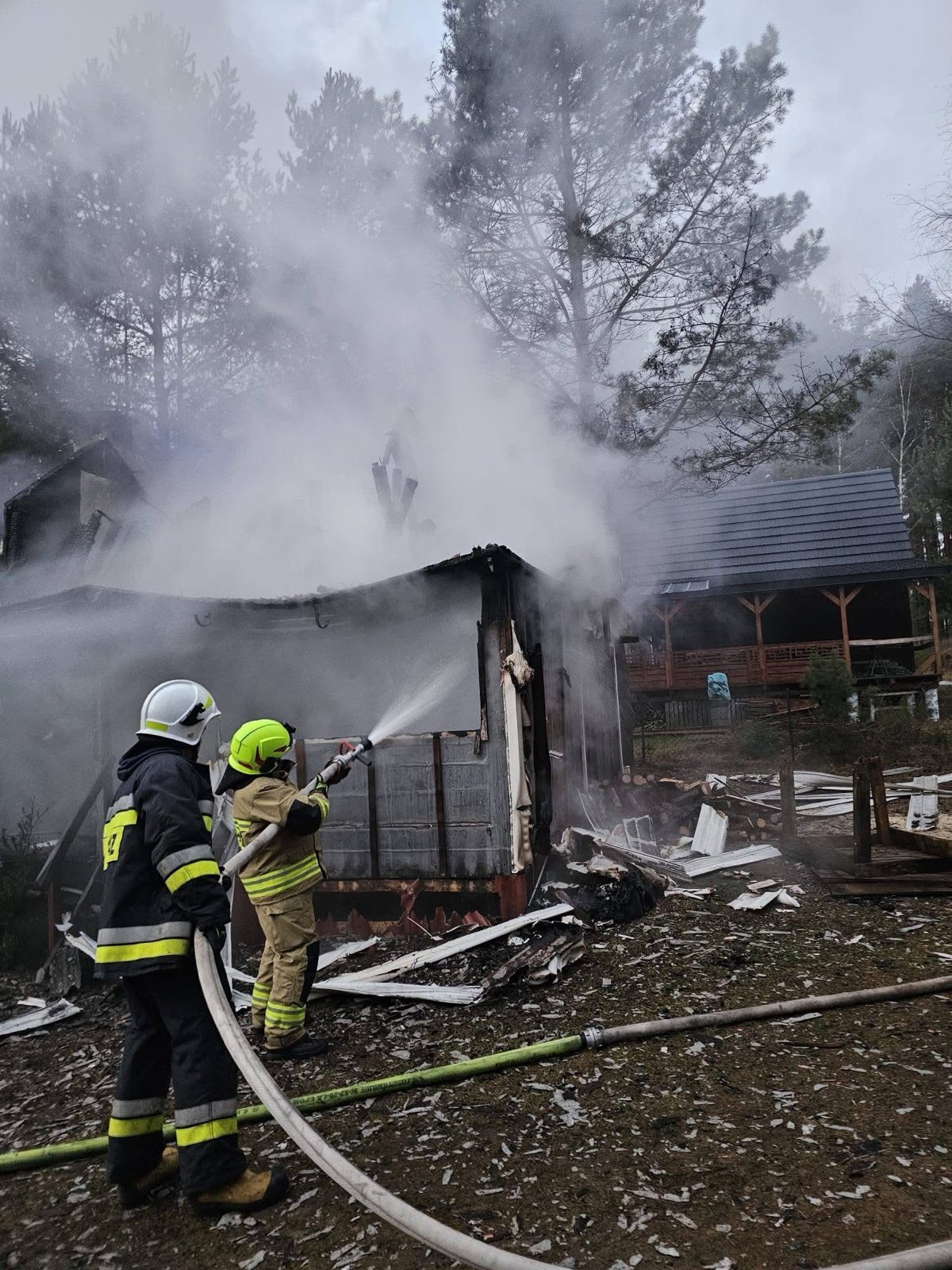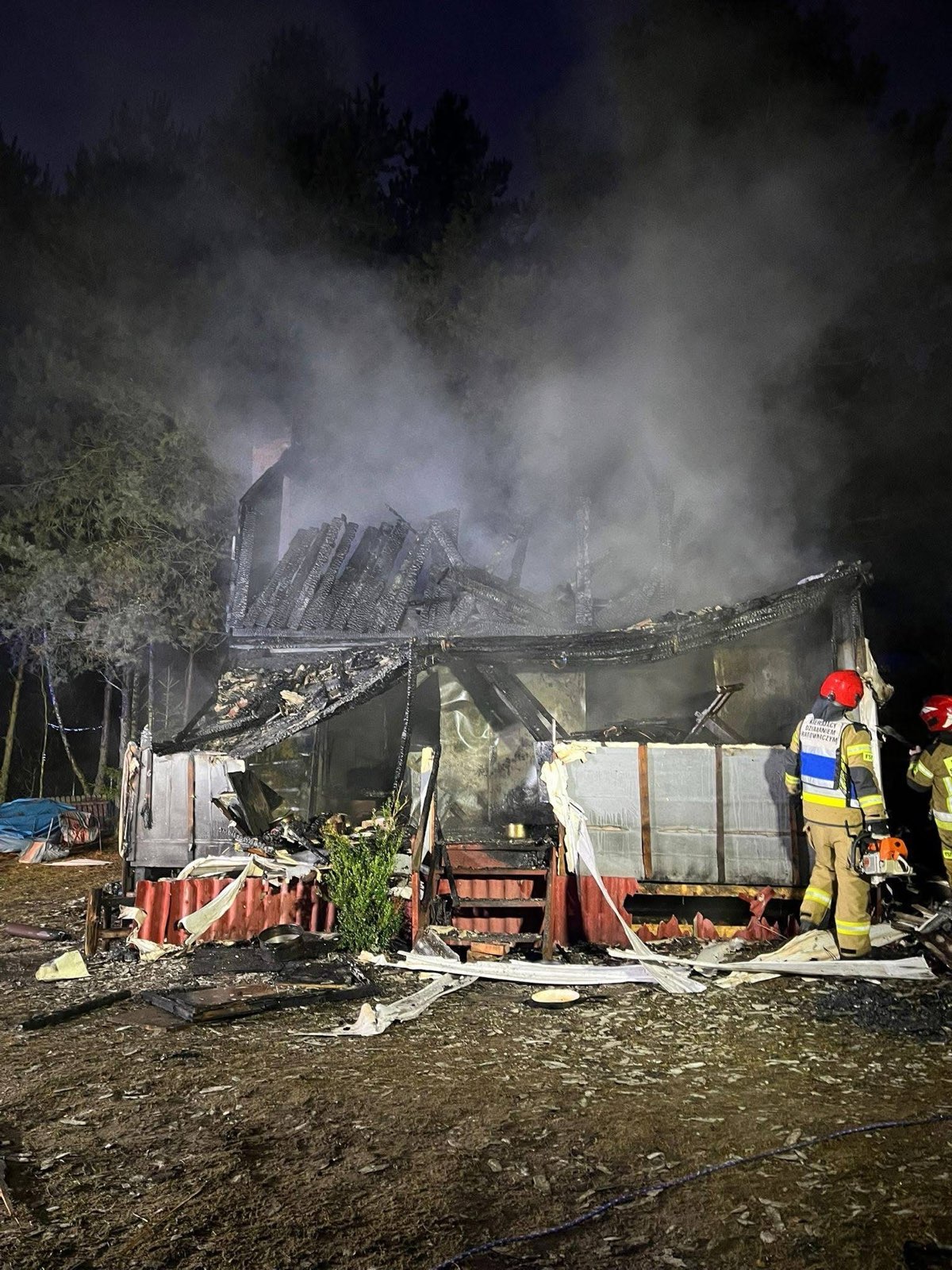 Po przybyciu na miejsce pierwszych zastępów, domek letniskowy był już cały objęty pożarem. Strażacy prowadzili działania w aparatach ochrony układu oddechowego oraz wyposażeni w kamerę termowizyjną. Z budynku wyniesiono butle z gazem propan butan. Mimo sprawnej akcji gaśniczej, domek uległ zniszczeniu. Spalona została konstrukcja budynku. Przyczynę pożaru ustala policja. W zdarzeniu, szczęśliwie, nikt nie ucierpiał.