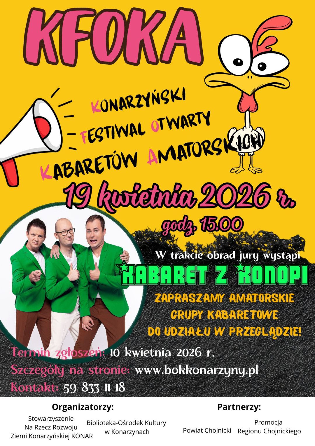 Konarzyński Festiwal Otwarty Kabaretów Amatorskich, w skrócie "KFOKA" - ta impreza już jutro (19.04.) w miejscowej Bibliotece-Ośrodku Kultury. Będzie występ profesjonalistów, ale najpierw na scenie zaprezentuje się 11 kabaretowych świeżaków.