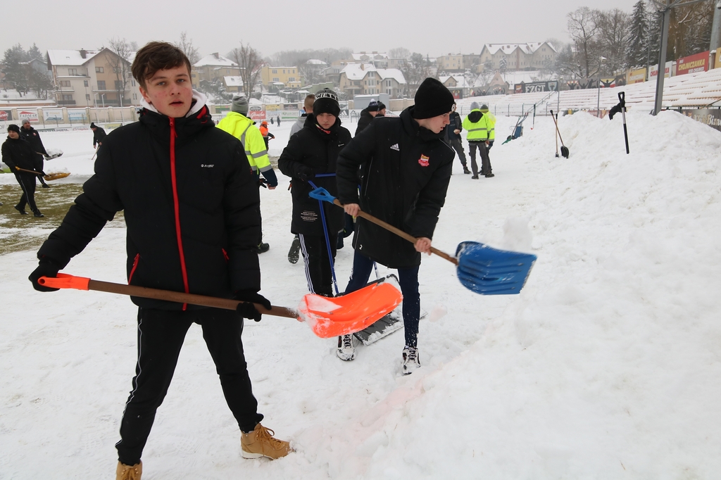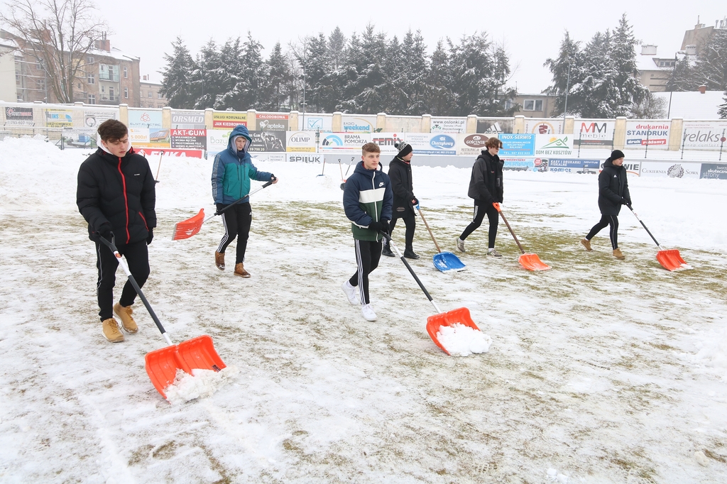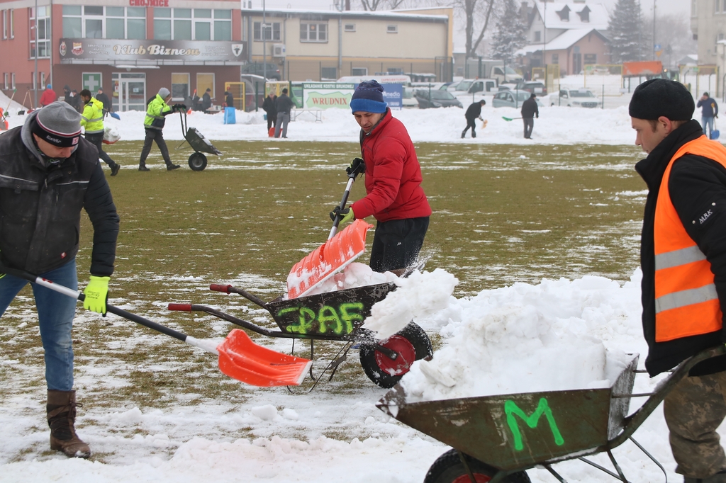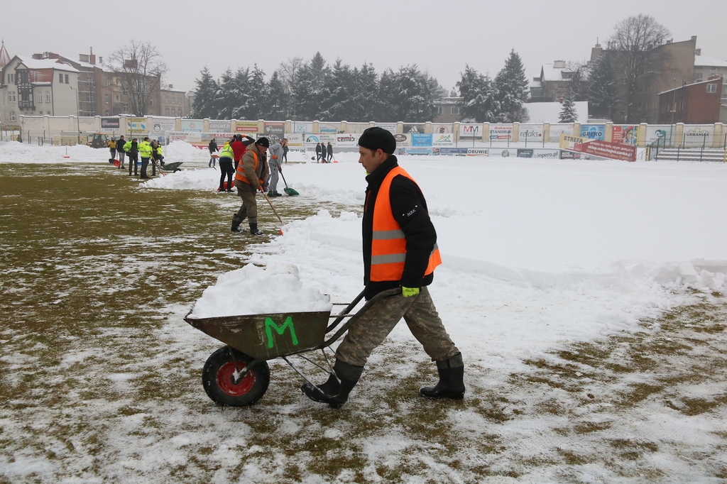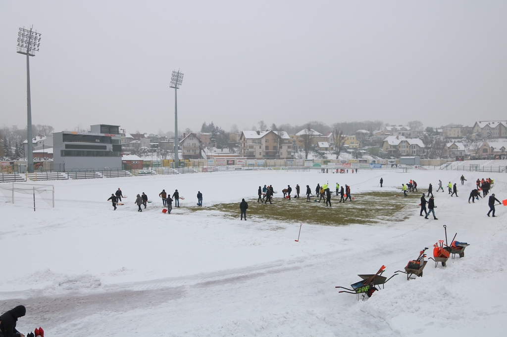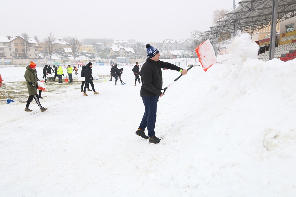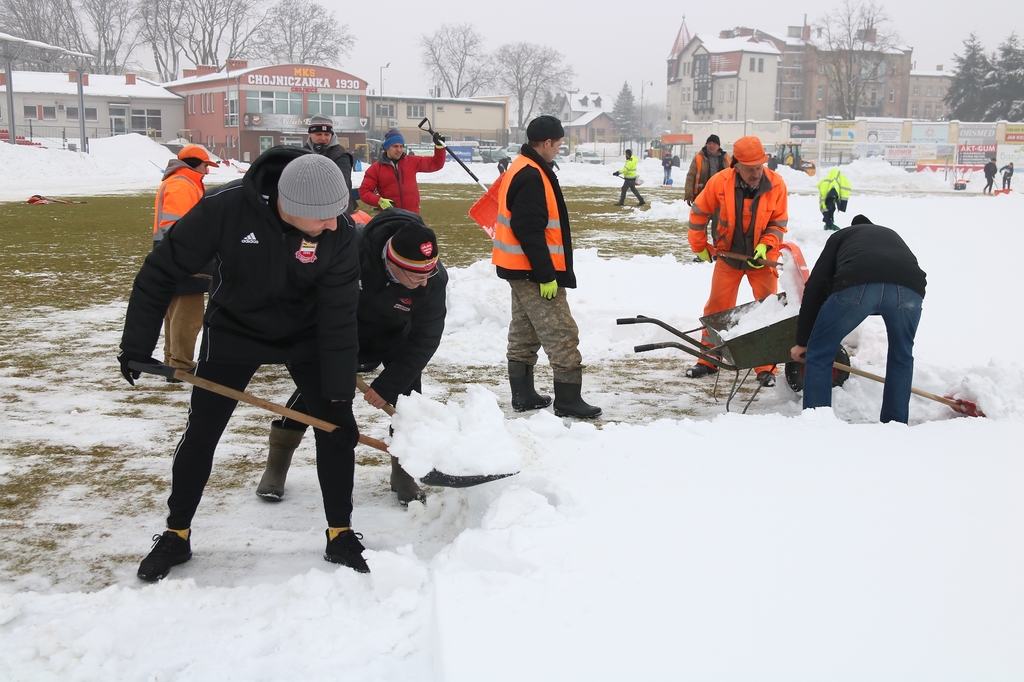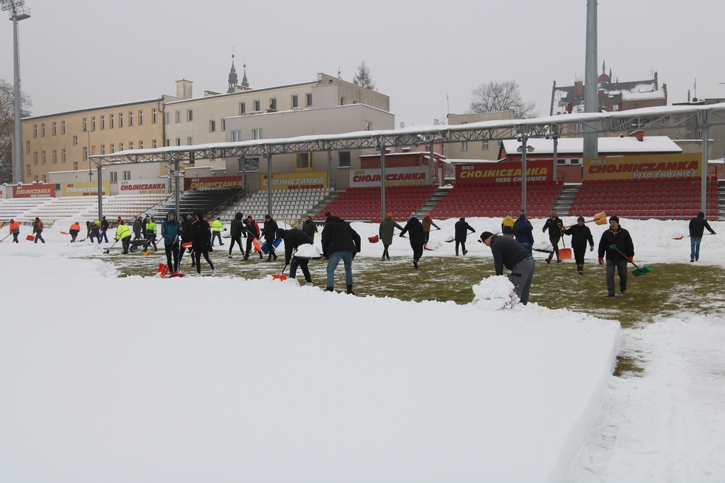 Zarząd i pracownicy klubu, trenerzy, młodzi zawodnicy, pracownicy sponsorów, ale też kibice – prawie 100 osób usuwa śnieg z boiska na stadionie Chojniczanki. O 9.00 ruszyła akcja „Odśnieżamy na Cracovię”. Wszystko po to, żeby „Chojna” mogła rozegrać u siebie mecz ćwierćfinałowy Pucharu Polski z Cracovią Kraków. Ten zaplanowany jest na 3 marca.
