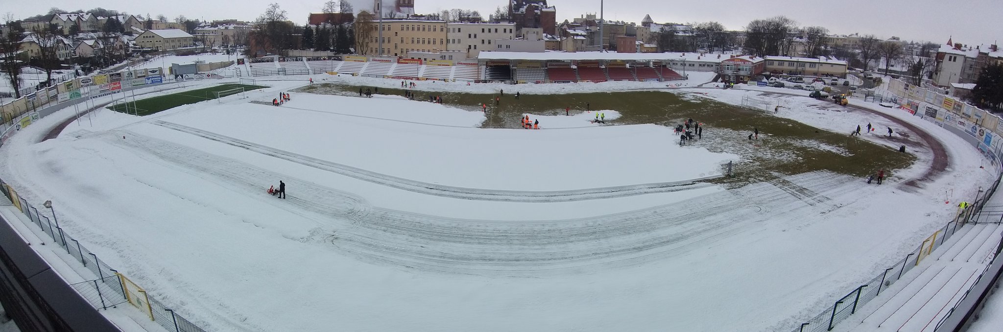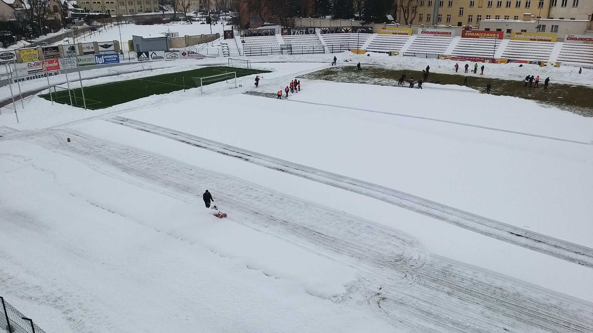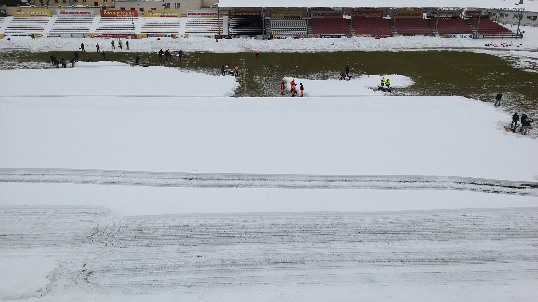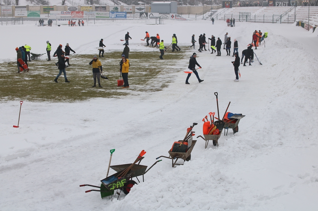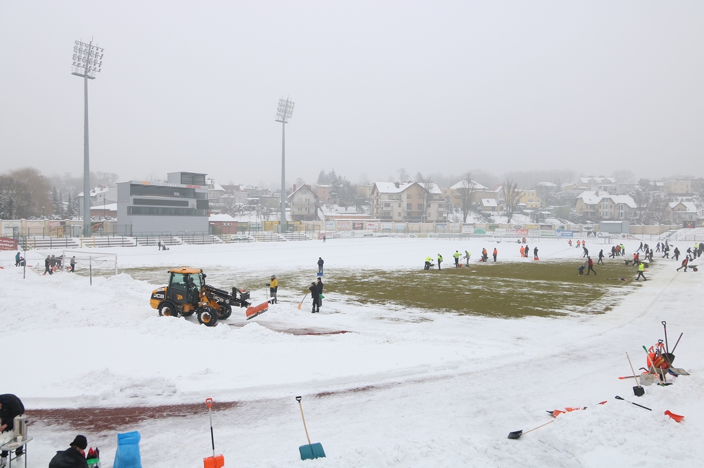 Zarząd i pracownicy klubu, trenerzy, młodzi zawodnicy, pracownicy sponsorów, ale też kibice – prawie 100 osób usuwa śnieg z boiska na stadionie Chojniczanki. O 9.00 ruszyła akcja „Odśnieżamy na Cracovię”. Wszystko po to, żeby „Chojna” mogła rozegrać u siebie mecz ćwierćfinałowy Pucharu Polski z Cracovią Kraków. Ten zaplanowany jest na 3 marca.