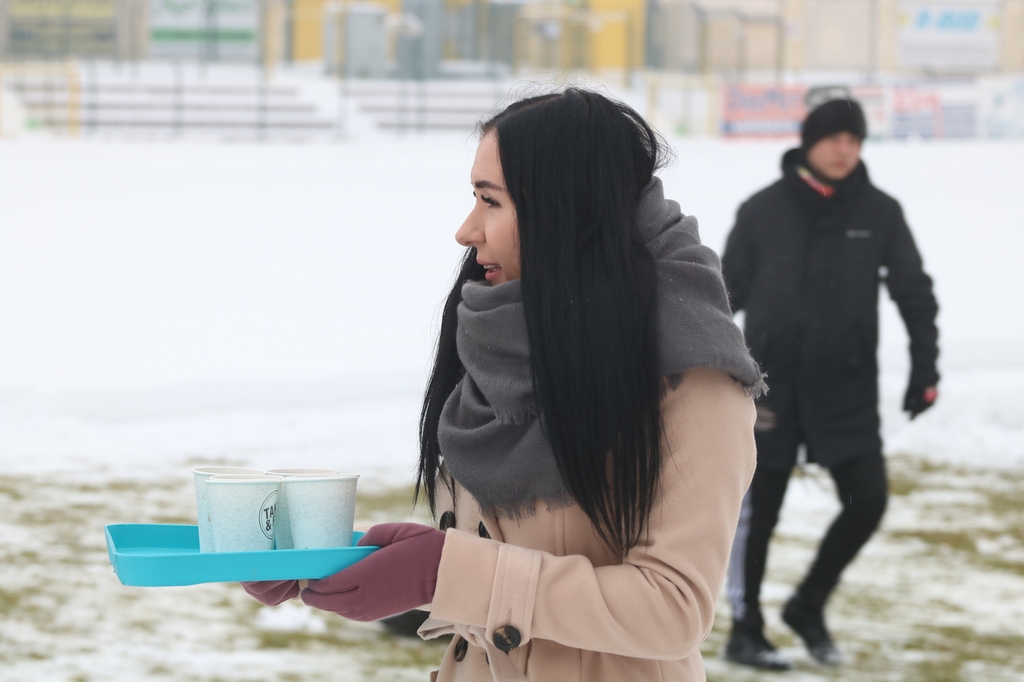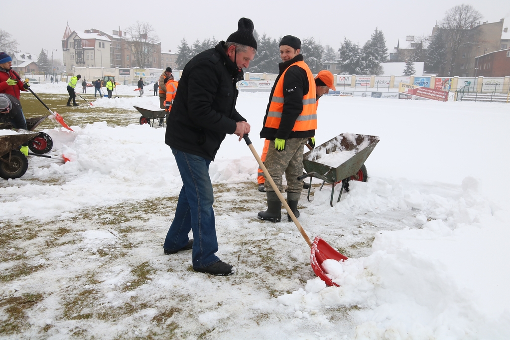 "Odśnieżamy na Cracovię". Prawie 100 osób usuwa śnieg z boiska na stadionie Chojniczanki (FOTO, WIDEO, ROZMOWA)